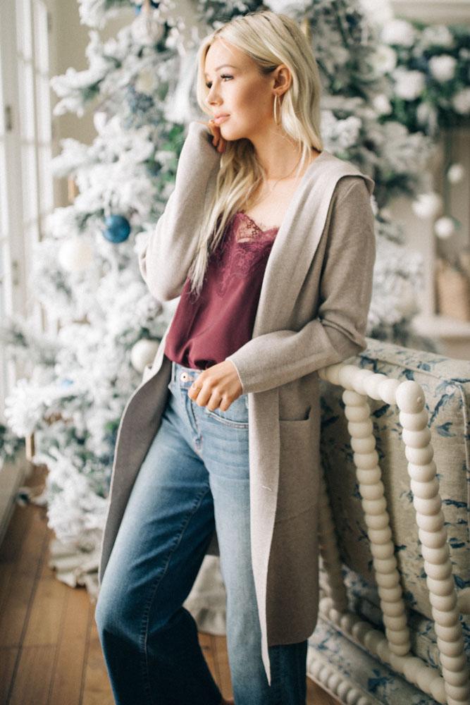 Our Cameron Hooded Cardigan is perfect for those who want to stay warm and comfortable while looking good. This long cardigan is made out of a thick knit material and features pockets and a hoodie.