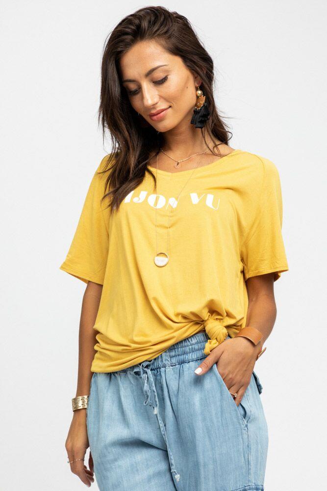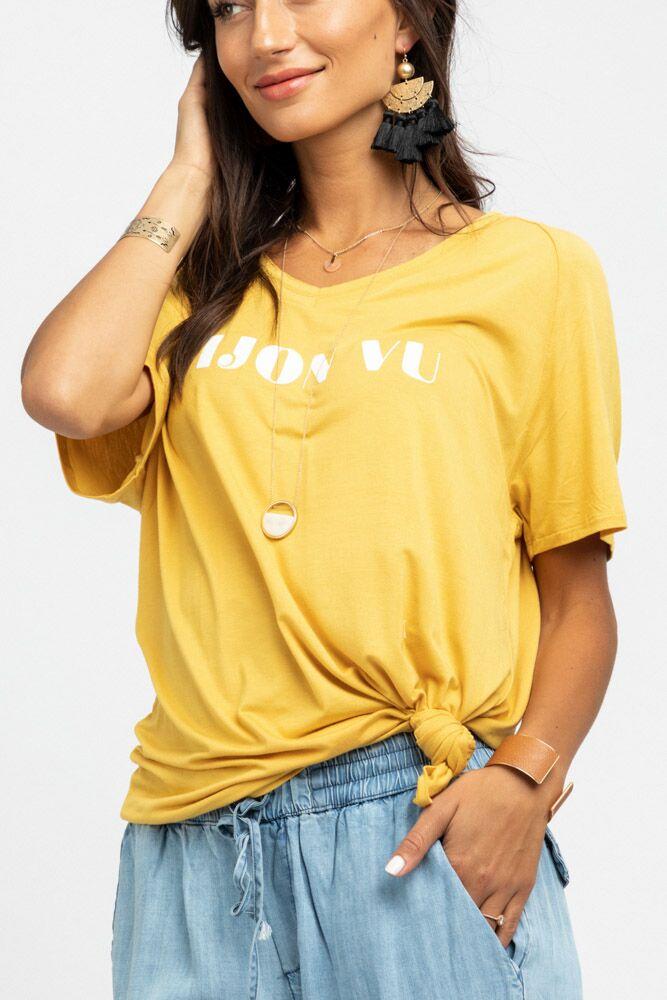 Talk about fun graphics! This oversize tee features a fun "Dijon Vu" graphic, short sleeves and a soft tee material. Tuck it in with high-waisted bottoms or modify it by tying a knot on the side to flatter your figure!