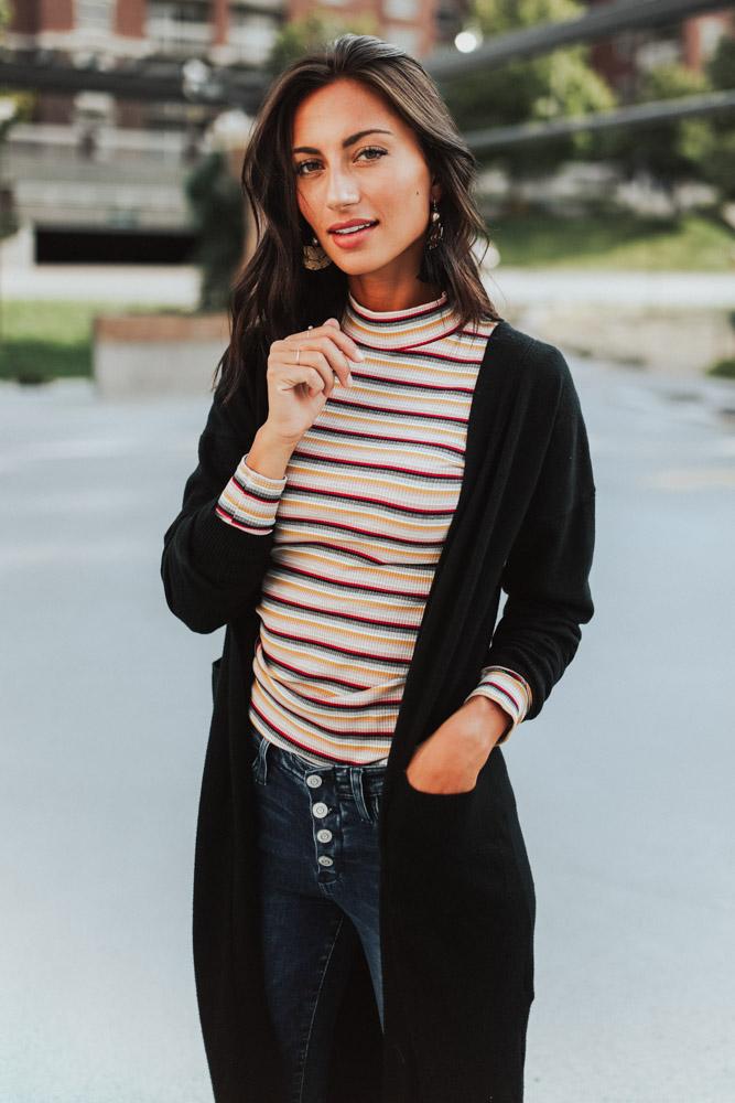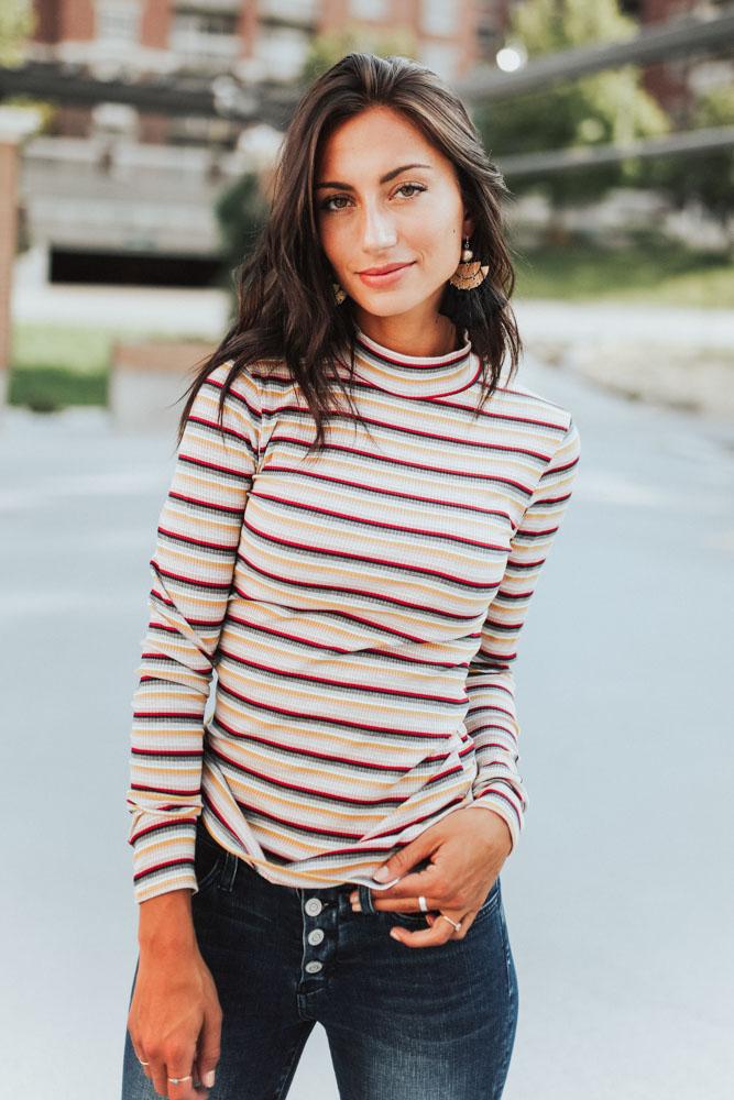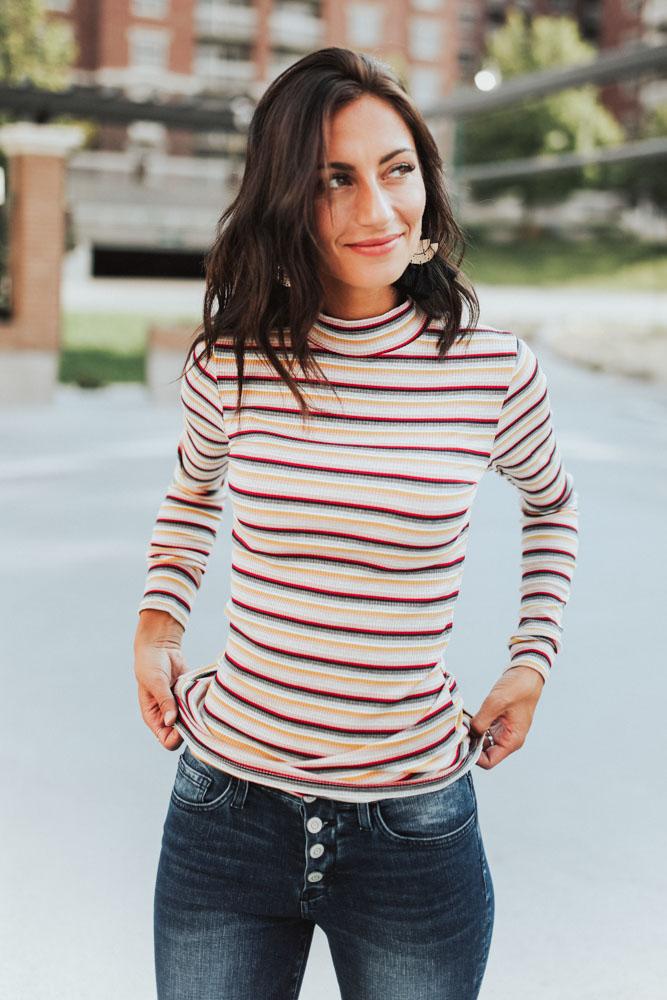 Bring in some color in the Emma Long Sleeve Stripe Mock Neck Top! Light weight knit with a multi colored stripe print. Mock neckline and long sleeves with a fitted bodice, that makes this the perfect layering piece for fall.